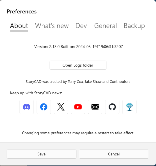 This tab identifies the current version and has links to keep up with StoryCAD on Social Media. You can also review StoryCAD here; additionally, you will also be prompted to review StoryCAD roughly once every six months.