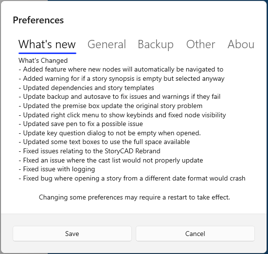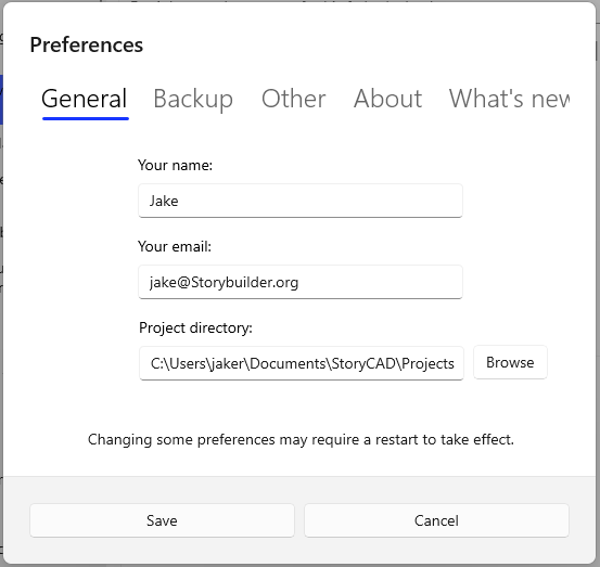Preferred Theme - This is the theme that StoryCAD will use. You can select between Light Theme, Dark Theme or to Use System theme, which will match the theme you have set within windows.