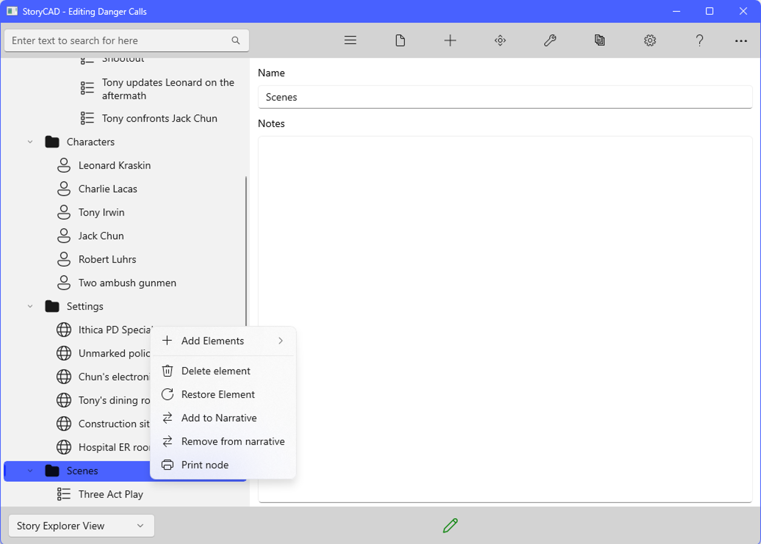 • Add Elements - Allows you to add a new Story Element such as a Problem, folder, character