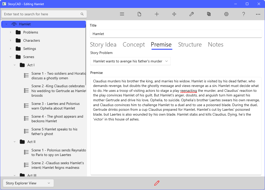 Your story can (and usually will) have more than one Problem. Every Problem has a Premise, but only one of your Problem story elements is the Story Problem. It’s the spine of your story; when it’s resolved, your story is over. Select one of your Problem pages from the drop-down list as the ‘Story Problem’ (here, ‘Hamlet wants to avenge his father’s murder’.)