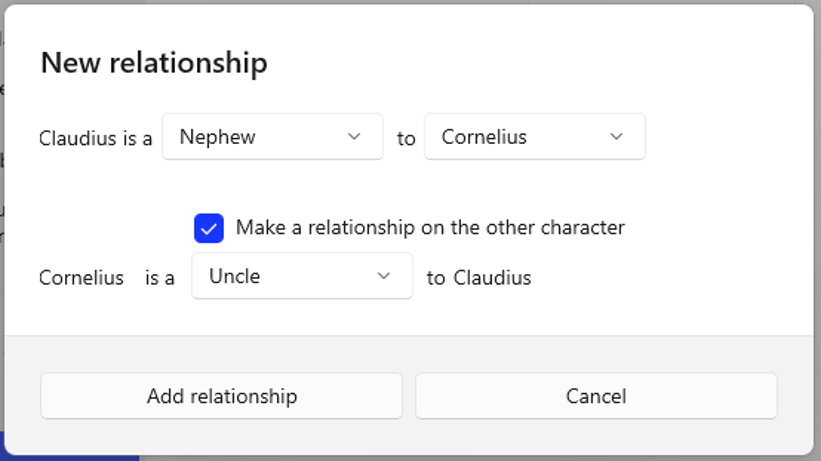 Check this box to define the inverse relationship. To complete that relationship, however, you must navigate to the other character.