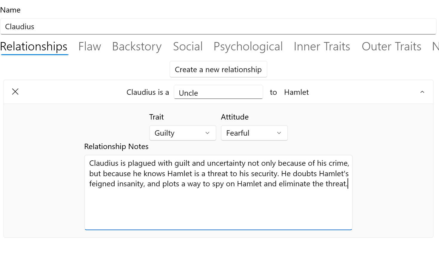 The Relationship tab on the Character form describes significant character-to-character relationships.