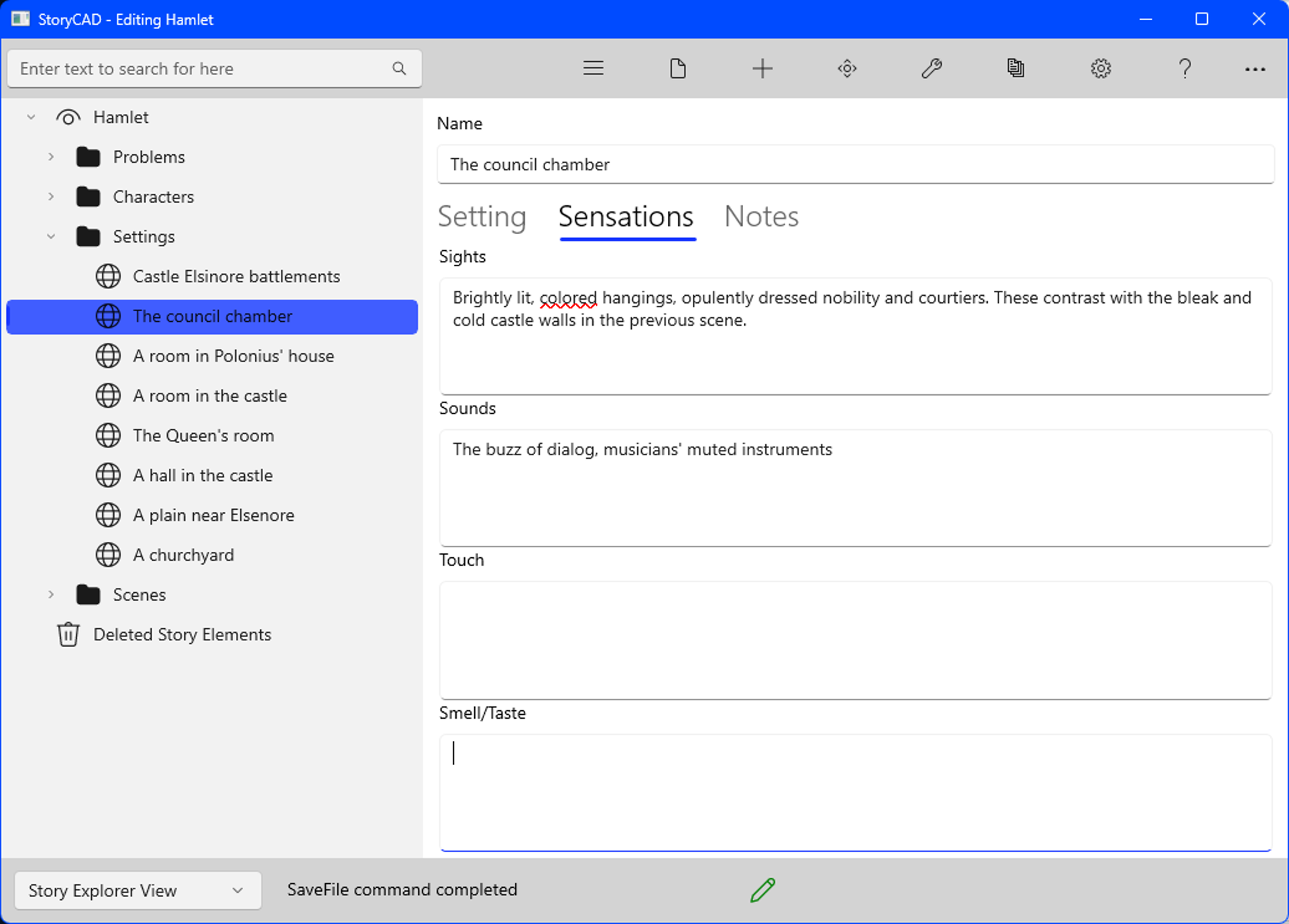 Your reader can only experience your settings through the eyes and ears of your characters. To make the setting as effective as possible, you must explore the impressions the setting makes on the five senses. This tab is a reminder to do so.