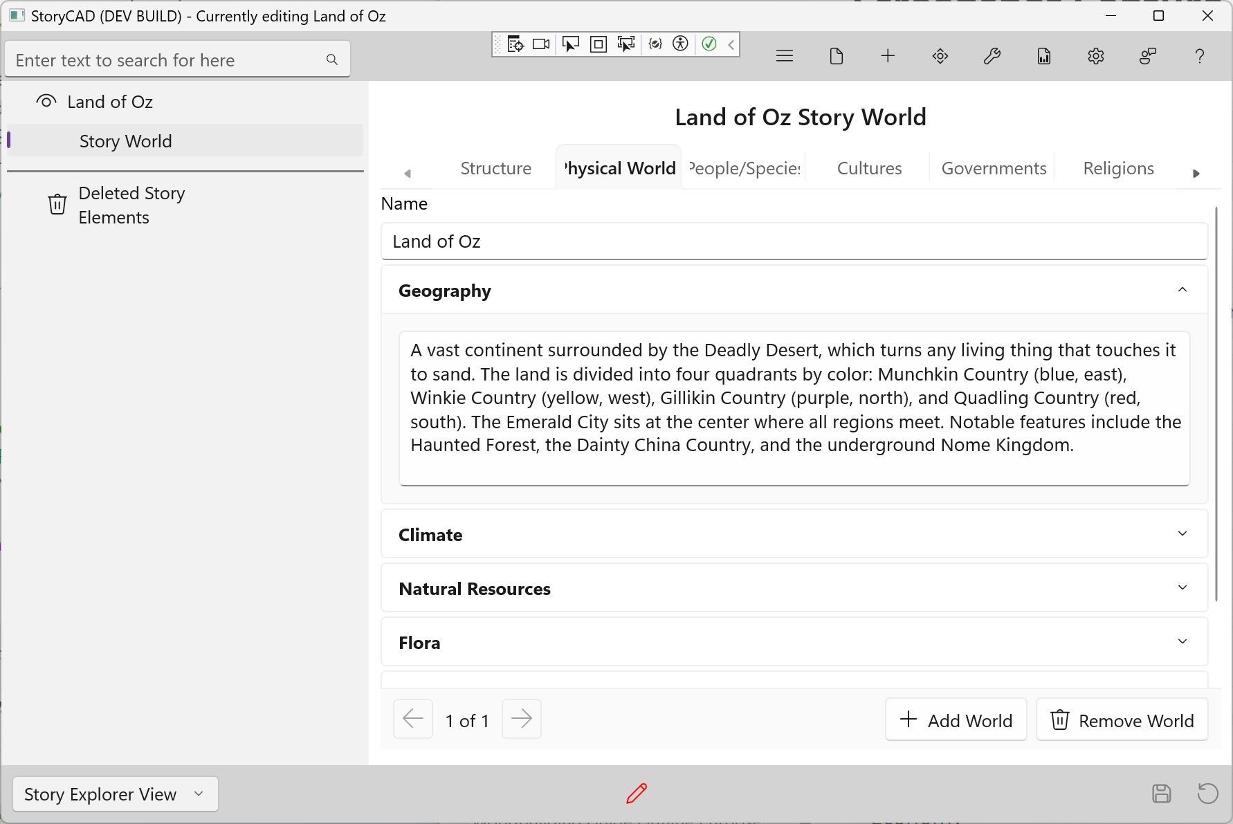 The Physical Worlds tab captures the geography, climate, and natural features of your world. This is a list-based tab—you can add multiple entries for stories with multiple worlds, planets, or realms.