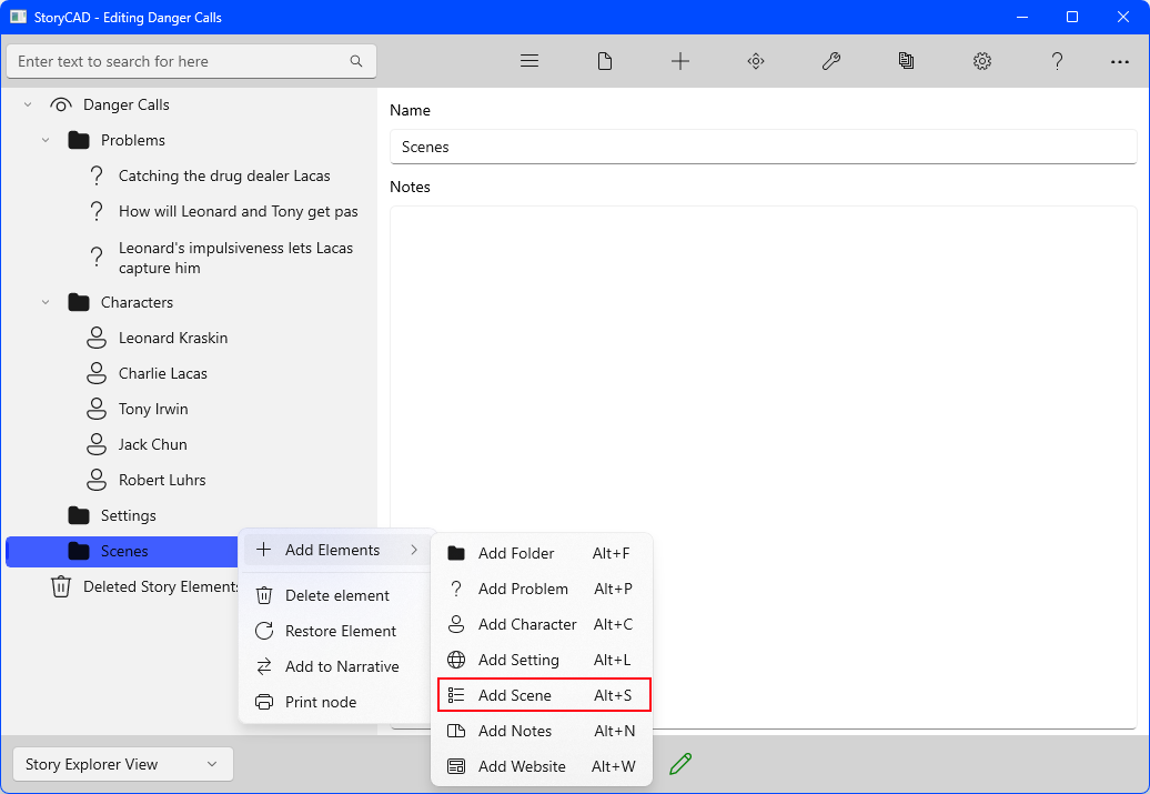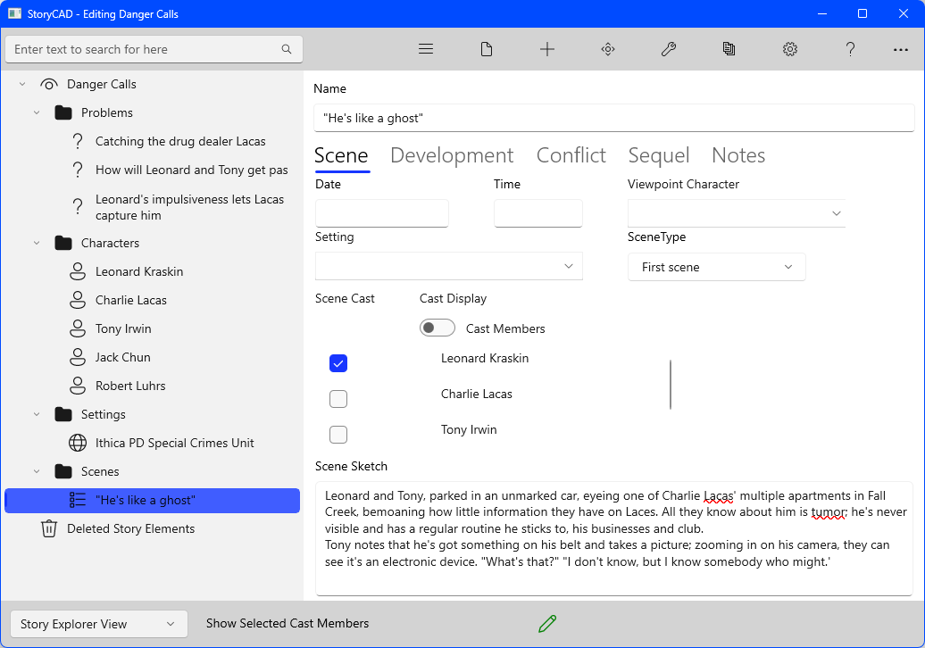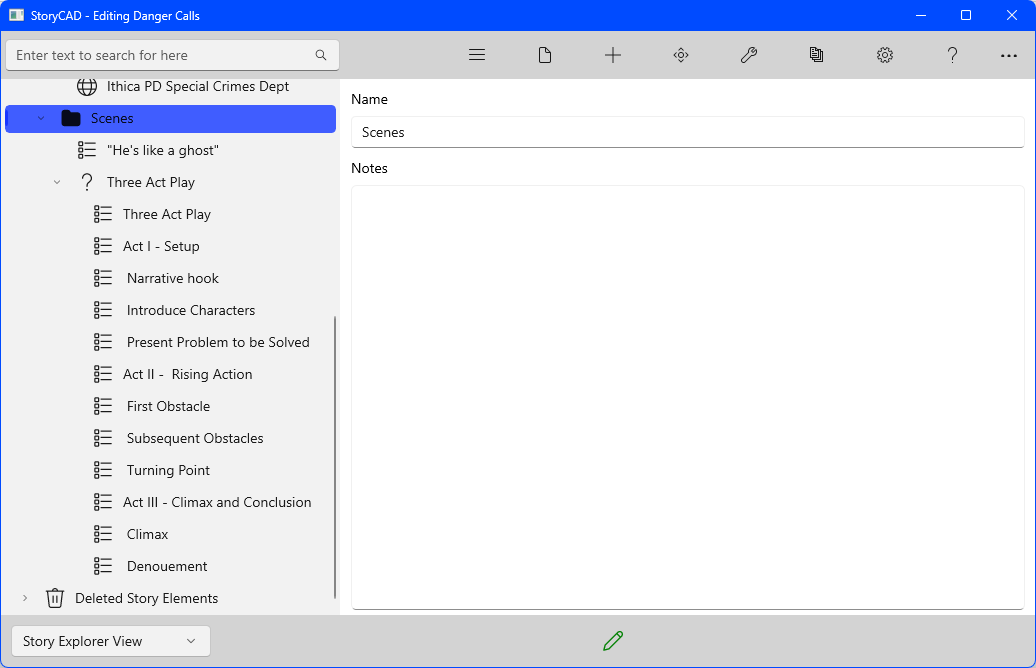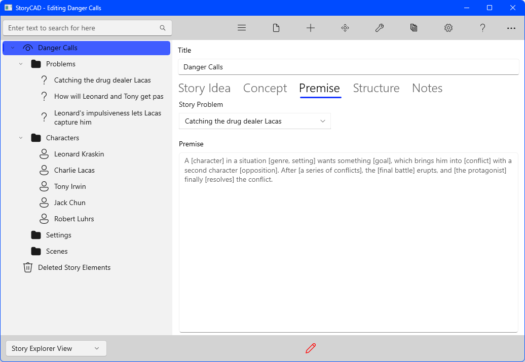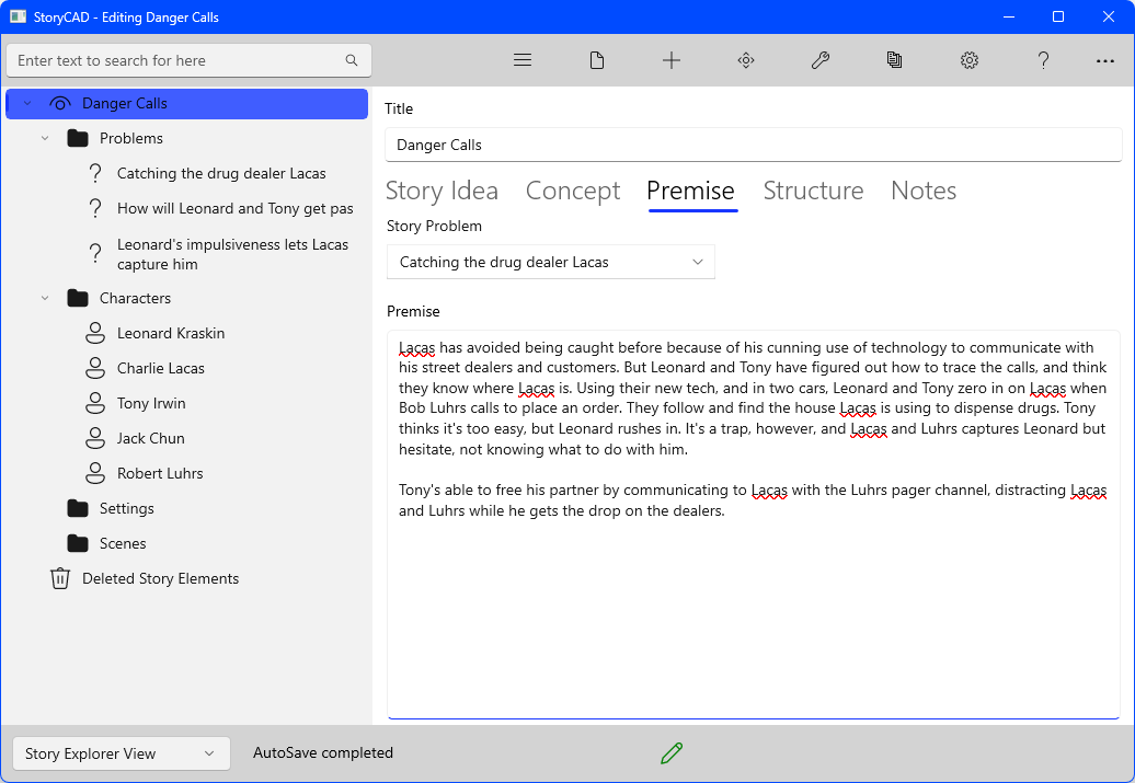 Note that the Premise here is just a read-only copy of the Premise on the Problem story node’s Resolution tab. Don’t forget to save your work- the red pencil on the Status bar is a reminder that you have unsaved work. You may want to take a look at the various backup and autosave options available in Preferences.
