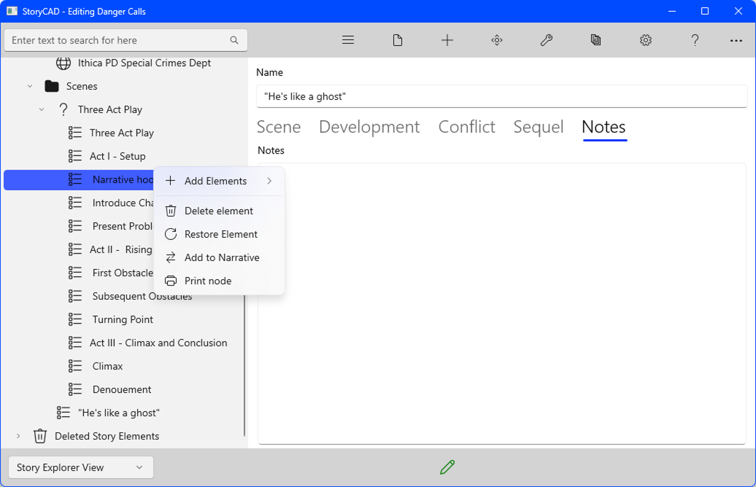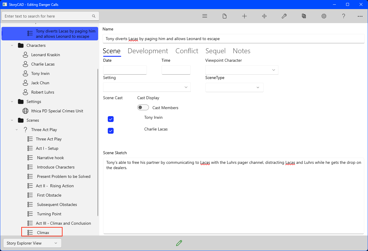 The two sub-problems have been moved under the main problem, and our one scene so far (‘He’s like a ghost’) has been moved under the problem it’s a part of. The MasterPlots tool was also used a second time, to copy a slightly different kind of story structure, a pattern of action- the Escape. Back when we worked on our story idea we already had an idea of what our climax scene would be; this placeholder represents that. Clicking on this scene, we can make it our own by renaming it to ‘Tony diverts Lacas by paging him and allows Leonard to escape’ and using our story Premise description. We also added the scene cast members by selecting their names from New Cast Member drop-down and clicking the ‘+’ Add Cast Member button.