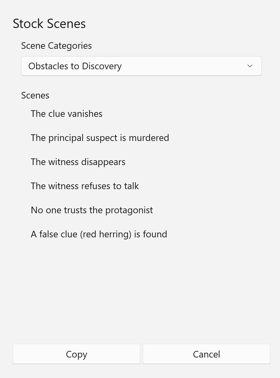 Another StoryCAD tool, Stock Scenes, lists a number of categories of scenes: